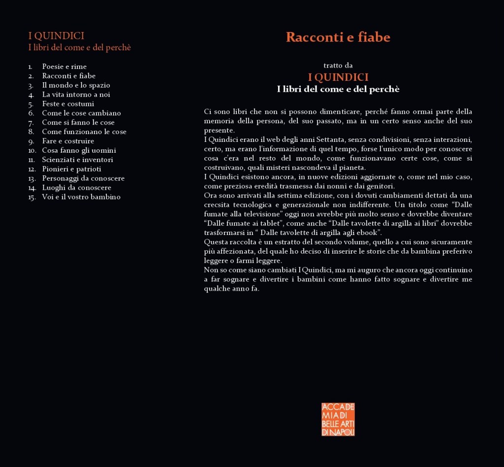 Some books cannot be forgotten, because they are now part of the memory of the person, of his past, but in a certain sense also of his own present time. “I Quindici” was the web of the seventies, without sharing, without interactions, sure, but they were the information of that time, perhaps the only way to know what was in the rest of the world, how certain things worked, how they were built, what mysteries the planet was hiding. “I Quindici” still exist, in new updated editions or, as in my case, as a precious inheritance passed on by grandparents and parents. Now they have reached the seventh edition, with the necessary changes dictated by one not indifferent technological and generational growth. A title like “From smokes on television” today would no longer make much sense and should become “From smokes to tablets”, as well as “From clay tablets to books” should turn into “From clay tablets to ebooks”. This collection is an excerpt from the second volume, the one I’m definitely on more affectionate, of which I decided to include the stories that I preferred as a child read or let me read. I don’t know how “I Quindici” has changed, but I hope they continue today to make children dream and have fun as they did me to dream and have fun few years ago.